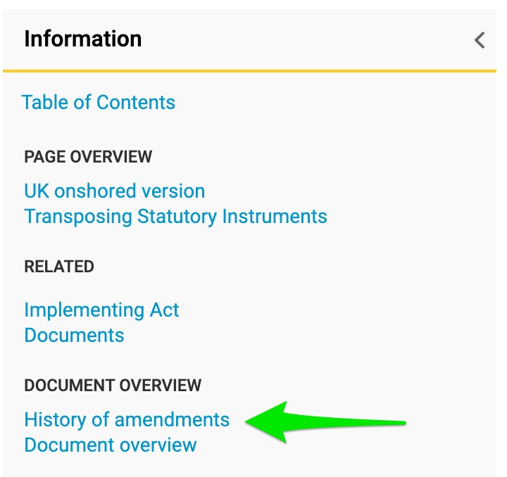 Amended legislation will have be a link to the 'History of Amendments' accessed via the Information panel. This page will detail all amendments within the document and link directly to the corresponding affected provisions.